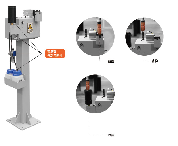 特制鉸刀和剪絲刀片,硬度高且兼有韌性,使用壽命顯著提高 電動馬達驅動,性價比高 過載保護裝置,保護馬達不受損壞 密閉噴油空間,廢油可收集回收,高效環保 焊槍上下移動清槍,定位精準 全自動清槍,無需人工操作